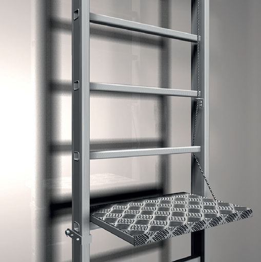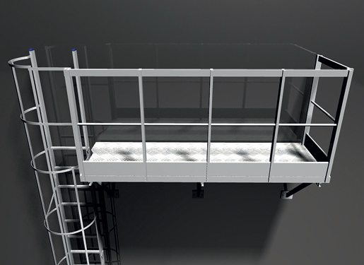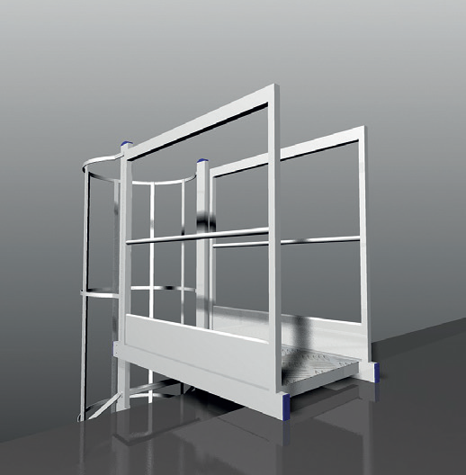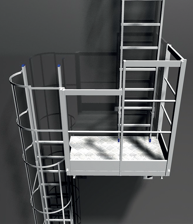 Piattaforma di sbarco con parapetto, progettata per consentire uno sbarco sicuro e agevole dalla scala. Disponibile con larghezza di 520 mm e lunghezza variabile da 630 a 1190 mm.