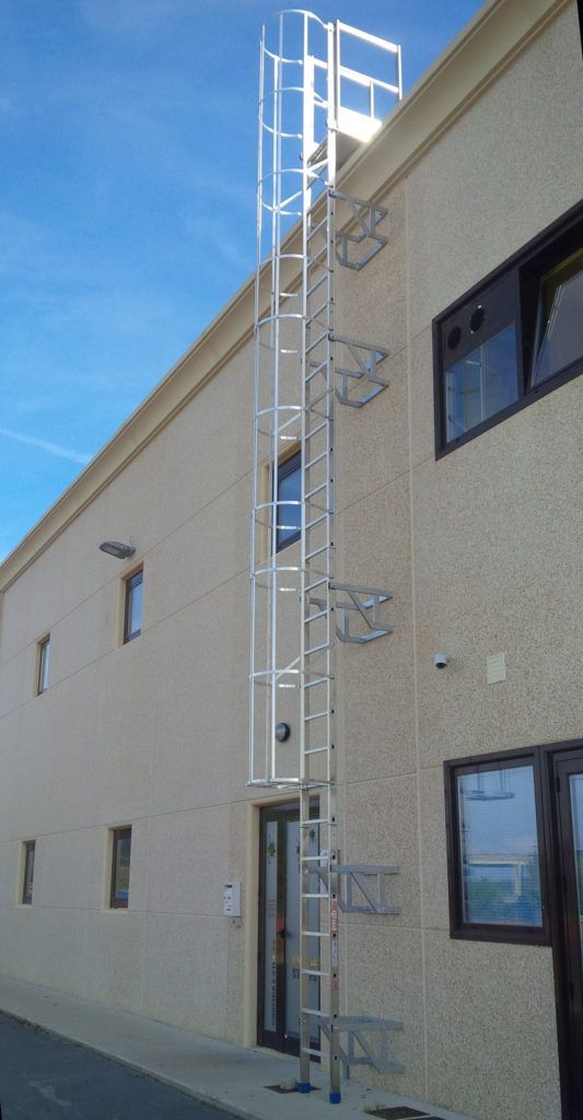 La struttura è realizzata in alluminio, con montanti elettrosaldati e pioli estrusi antisdrucciolo, studiati per offrire robustezza, durata e comfort di utilizzo. Le scale sono composte da moduli standard, con tronco di base realizzato su misura, e prevedono sistemi di collegamento sicuri tra i vari elementi. Il parapetto di sbarco, alto 1,10 m, completa la dotazione in corrispondenza dei punti di uscita, mentre per sviluppi superiori ai 10 metri sono previsti pianerottoli di riposo.